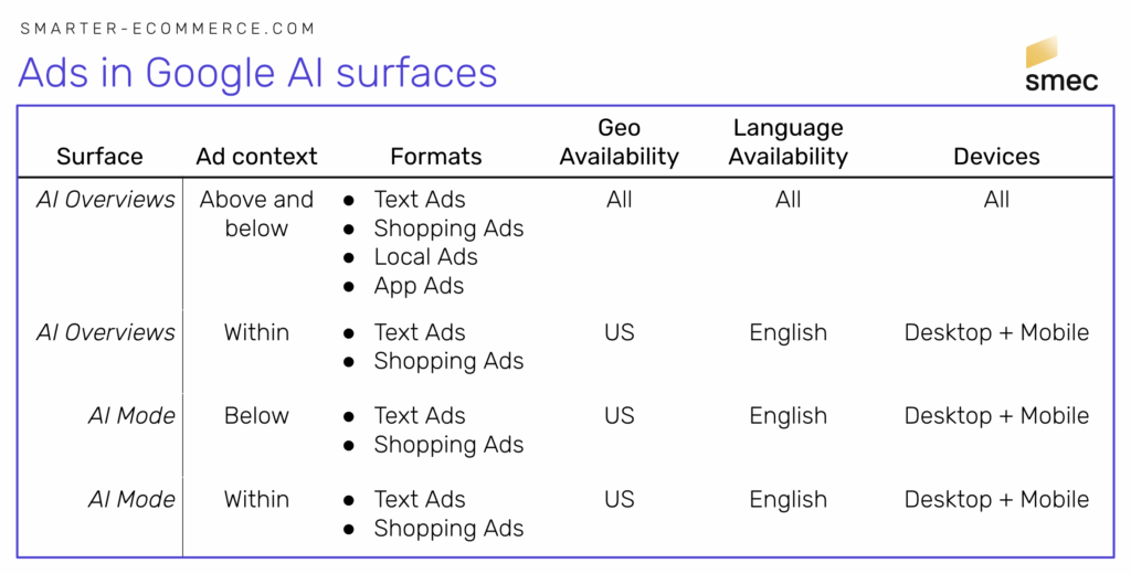 At time of writing, ads are fully launched worldwide above and below AI Overviews. They are rolling out in the US for ads within AI Overview and below AI Mode, while ads are only being tested within AI Mode. Google has hinted that more ads could start appearing in more AI contexts in English-speaking markets soon.