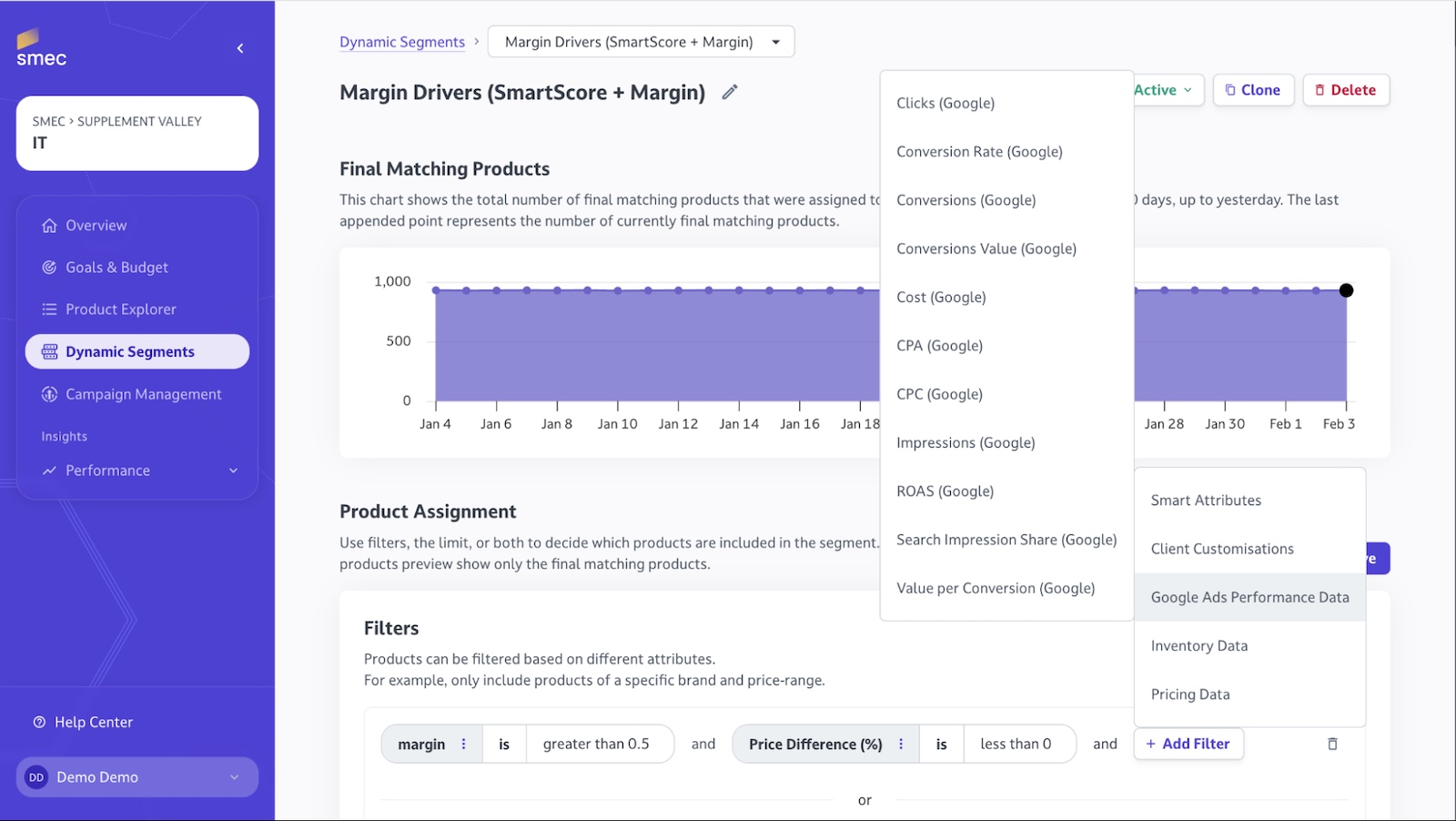 Dynamic Segments is a strategic product-clustering feature, developed by Smarter Ecommerce (smec) that allows retailers to group products based on multi-dimensional business data rather than static attributes. By combining metrics like real-time price competitiveness, margin, and performance data, Dynamic Segments enable the automatic steering of Performance Max (PMax) campaigns toward specific business outcomes like Profit on Ad Spend (POAS) or high-volume revenue growth.