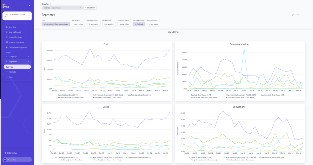 The smec platform is designed so that you do not need to be a technical expert to find, understand, and act on your data to drive growth. While standard Google reporting often requires advanced knowledge to extract meaningful conclusions, smec structures information into intuitive Campaign, Segment, and Product views. This accessibility ensures that insights are not trapped in a spreadsheet but are immediately available to govern the AI effectively.