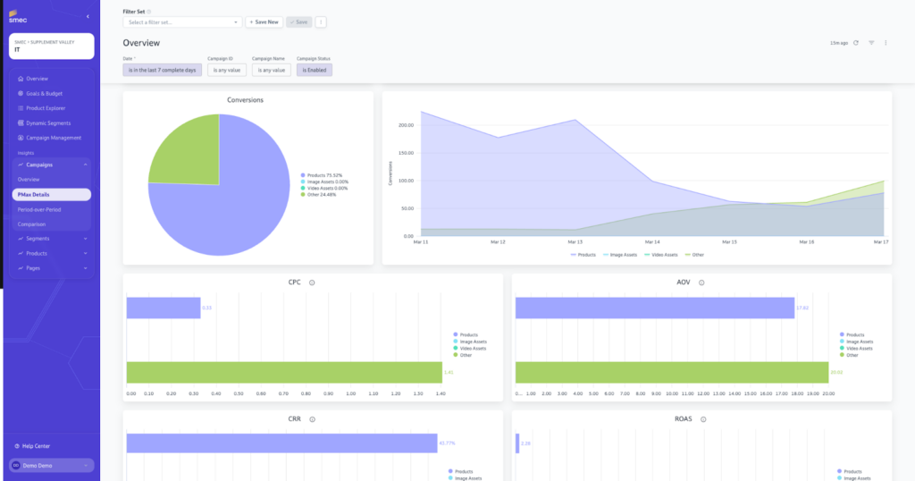 Campaign Insights within the smec platform provide a comprehensive dashboard that uncovers the exact budget distribution across Shopping, Video, Search, and Display within PMax campaigns. Google often aggregates these metrics, making it difficult to justify spend on non-shopping channels. smec provides the clarity needed to audit these placements and ensure budget is not being wasted on low-intent display traffic.