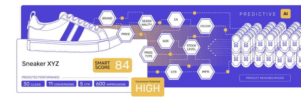 Yes, through a feature called SmartScoreAI, the platform automates the evaluation of new products using the “Neighborhood Effect.” Instead of waiting weeks for manual data collection, the AI automatically assigns a score to new items based on the performance of similar “peer” products, allowing them to gain immediate, automated visibility in your campaigns.