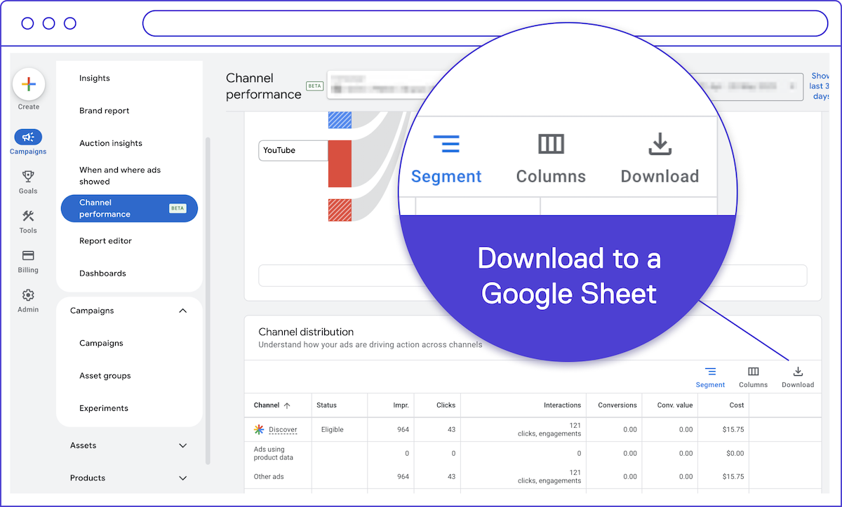 These views uncover trends that the default export buries. Whether you want to evaluate asset-heavy campaigns or spot how Shopping drives results versus Display or YouTube — it's all there, clean and ready to act on.
